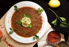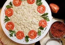 300 г • Свежие овощи (помидор, сладкий перец, огурец, лук, петрушка), оливковое масло, сумак, соль, перец